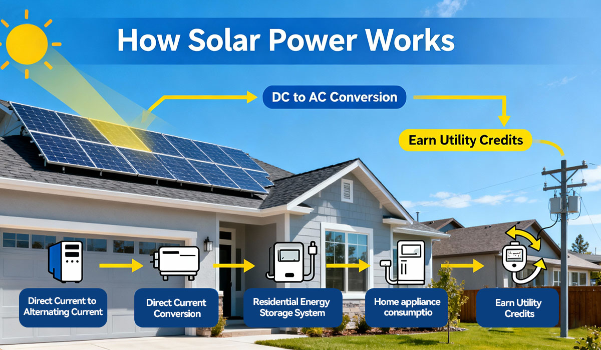In a nutshell, solar power converts sunlight into electricity you can use in your home. Here's the simple process: