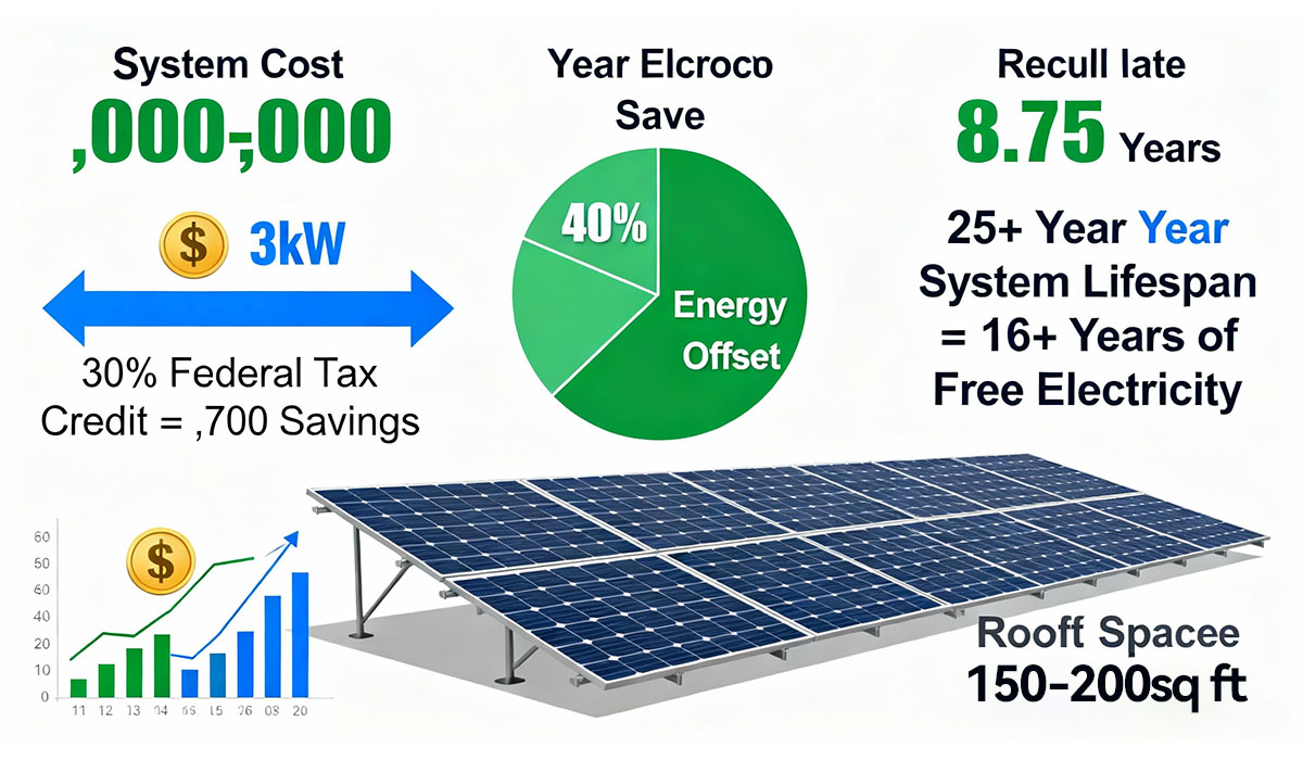 The financial savings are where a 3kW solar system really shines. The average U.S. home uses about 30 kWh per day. A 3kW solar power system can offset a significant portion of that.